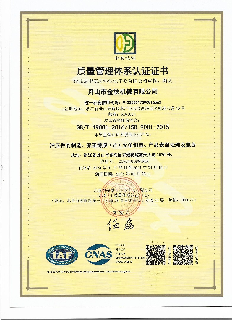 舟山市金秋機(jī)械有限公司是一家集金屬表面技術(shù)加工處理、電子元件生產(chǎn)、機(jī)械制造與研發(fā)為一體的科技型企業(yè)。占地5萬多平方米,廠區(qū)地理位置十分優(yōu)越,并擁有專業(yè)技術(shù)團(tuán)隊(duì)十余人。公司致力于生產(chǎn)晶振外殼、流延機(jī)制造與研發(fā),石油抽油泵柱塞及表面工藝處理等。公司生產(chǎn)的石油抽油泵柱塞已經(jīng)出口印尼和美國。研發(fā)生產(chǎn)各種型號的流延機(jī)是采用日本目前先進(jìn)的技術(shù);49U/S晶振外殼已經(jīng)從第一代升級為目前第六代產(chǎn)品,并仍在研發(fā)更高端的SMD替代品,并與上海交通大學(xué)合作研發(fā)新能源項(xiàng)目。公司通過了ISO9001質(zhì)量體系認(rèn)證,擁有自主知識產(chǎn)權(quán)的發(fā)明和實(shí)用新型專利共計(jì)三十多項(xiàng),分別被評為國家高新技術(shù)企業(yè)、省、市專利示范企業(yè),省科技型企業(yè)等榮譽(yù)稱號。
